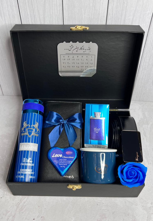 پک کادو تولد و عیدی مردانه ، باکس هدیه لوکس و لاکچری آبی ۲۱۴