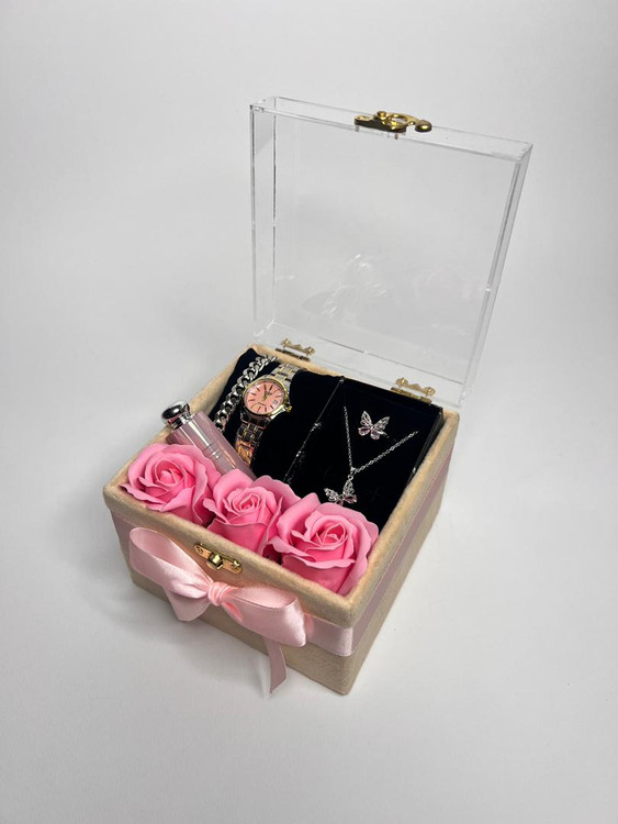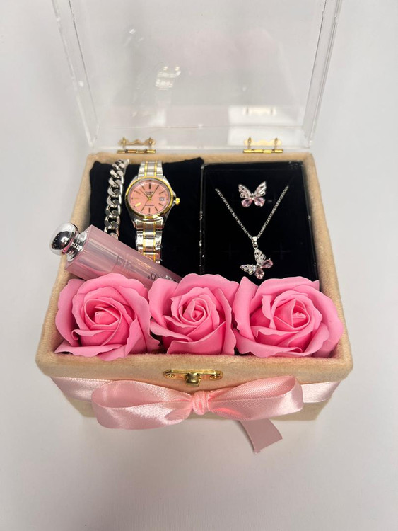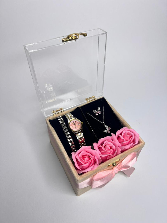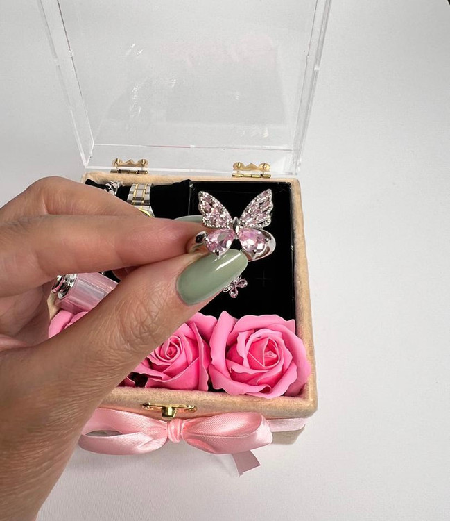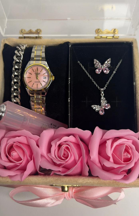 باکس هدیه صورتی :گردنبند و انگشتر پروانه ای ساعت دخترانه شیک ۲۴۹