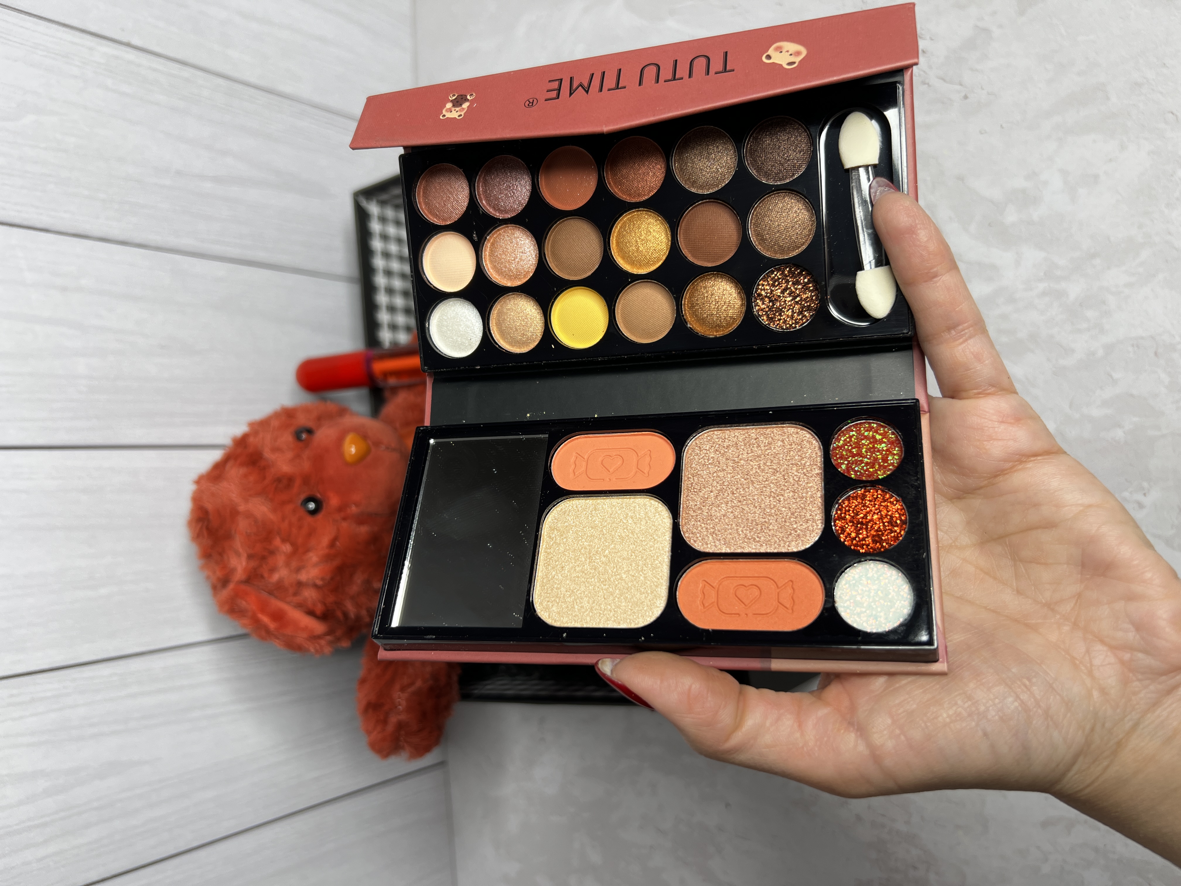پالت آرایشی شامل سایه، رژگونه، سایه گلیتری رنگهای جذاب