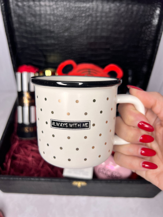 ماگ سفید نسبتا بزرگ با خال طلایی و نوشته ی عاشقانه